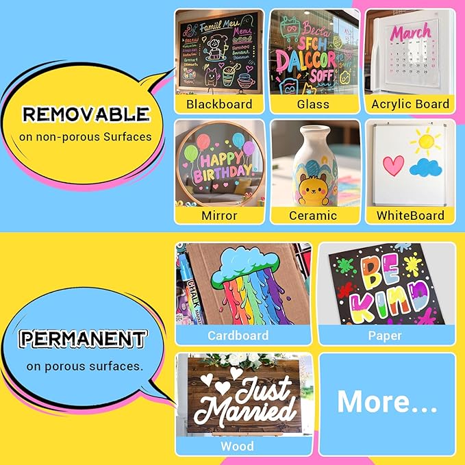 - 【Works on Most Non-Porous Surfaces】Our chalk car window markers are versatile and can be used to decorate a variety of non-porous surfaces including cars, windows, glass doors, windshields, posters, mirrors, chalkboards, craft paper, classroom blackboards, whiteboards, bistro menu boards, wedding signs, metal surfaces, LED writing boards, Christmas banners, graduation decorations, cafe menus, lunch menus, holiday decorations, non-porous chalkboards, signs, and most other non-porous surfaces.