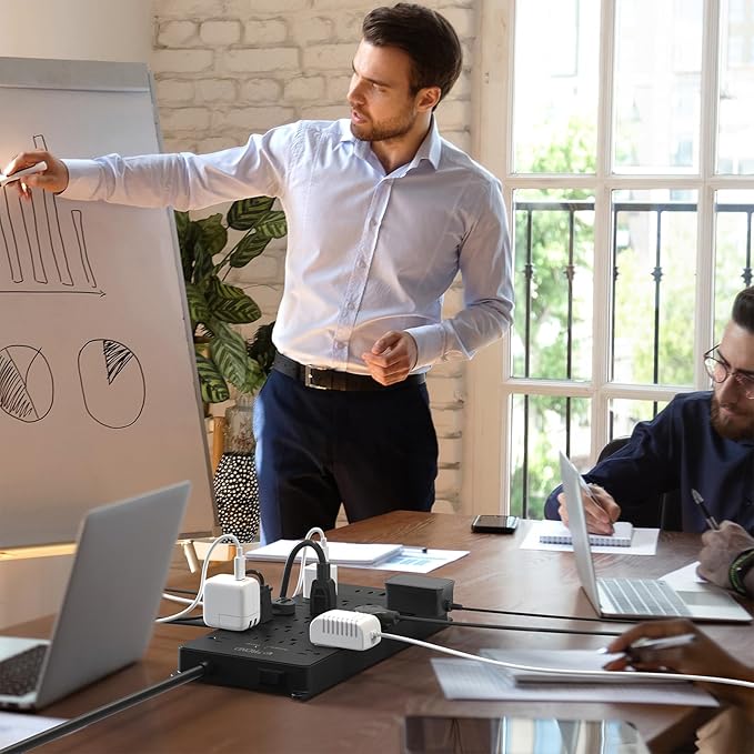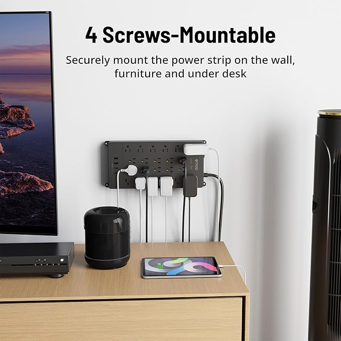 - 【Mountable and Flat Plug】Our power strip equipped with 4 screw holes in the corners, allows you to securely mount the surge protector box on the wall or under the desk. The 45° angle flat plug design is perfect for hiding behind furniture, bookshelves, and bedside tables in tight spaces