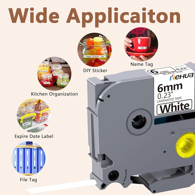 Hehua 6mm 0.23 Extra Strength Adhesive Laminated White Tape Compatible for Brother TZe-S211 TZeS211 TZ-S211 TZS211 for Ptouch PT D210 D200 H110 H100, 1/4'' x 26.2ft Black on White, 4 Pack