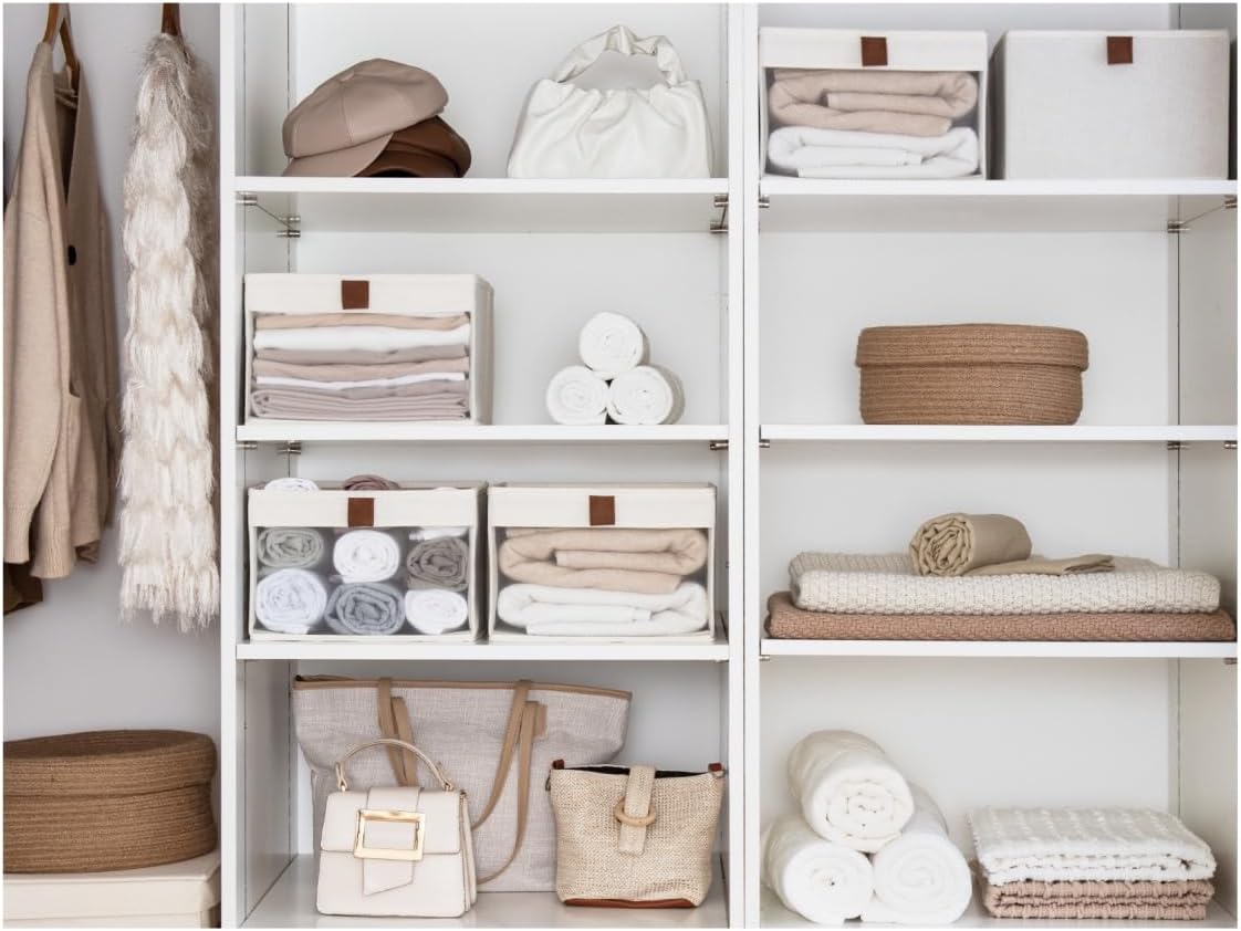 StorageWorks Closet Storage Bins, Storage Baskets with Clear Window and Handles, Foldable Fabric Organizer for Clothes, Shelves, Beige, 3 Pack