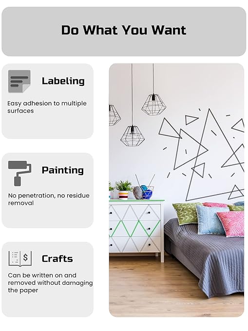 - Easy to Remove & No Residue: Tape features a low tack adhesive, which is pressure sensitive adhesive that can be used to reposition or reuse the tape anywhere, it is easy to peel, and reposition, without leaving any residue