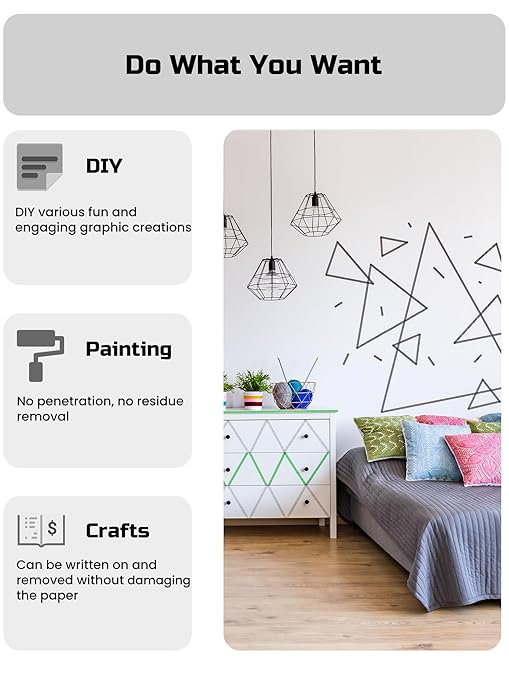 - Easy to Remove & No Residue: Painters tape features a low tack adhesive, which is pressure sensitive adhesive that can be used to reposition or reuse the tape anywhere, it is easy to peel, and reposition, without leaving any residue