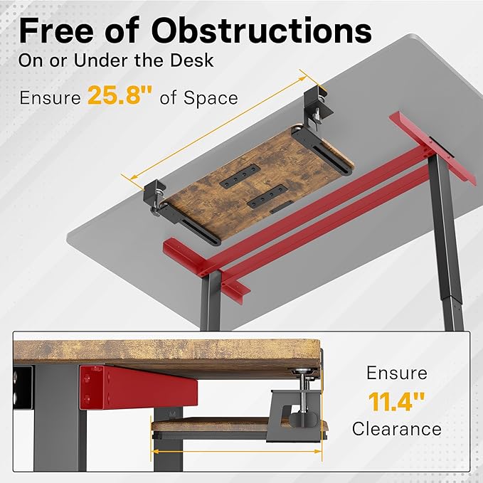 - ✅ SPACIOUS AND STRONG KEYBOARD PLATFORM – The 25.6" x 11.8" surface supports up to 11 lbs and slides out easily when in use. Designed for standard keyboards and mice. Not recommended for vertical mice or split ergonomic keyboards due to height clearance