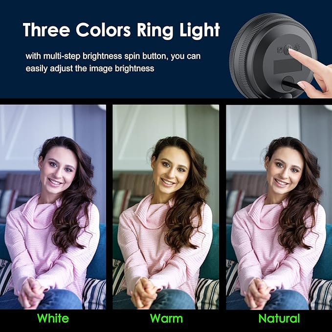 - 【3 Colors and Multi-step Brightness Webcam 】 The streaming camera with ring light that offers lighting compensation at three different colors with touch control back of the webcam. You could choose the brightness and colos you like depending on your environment, achieving your ideal light conditions.