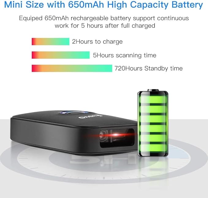 - 【High Compatibility & 650mAh High Capacity Battery】: Eyoyo scanner can connect with laptop, PC, POS, smartphone, tablet, iPhone, iPad and computers to perfectly work with common operating systems such as windows xp/7/8/10, Mac OS, Linux, Windows Mobile. Also with 650mAh rechargeable battery can continuously work for 5 hours after 2 hours fully charged.