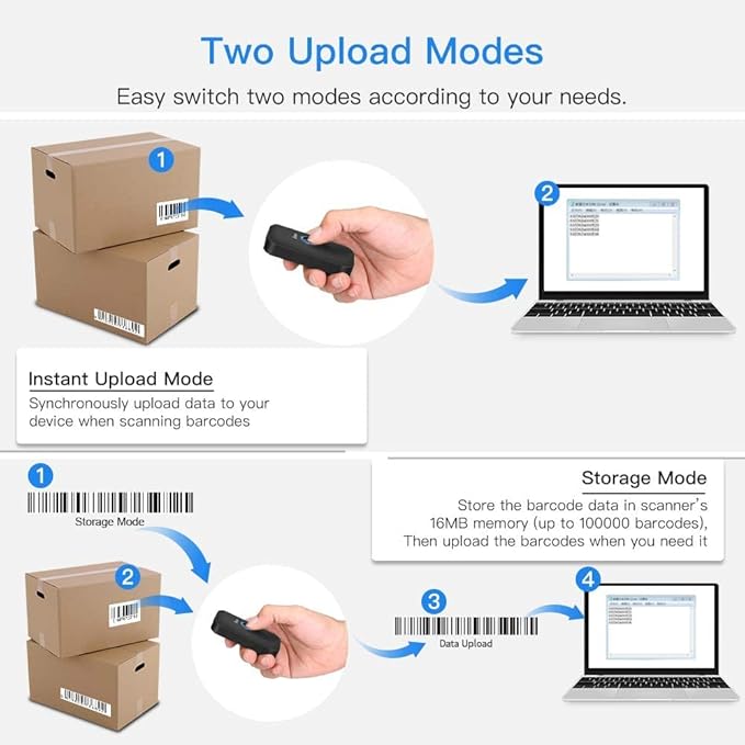 - 【Multiple Configuration Options】: Eyoyo wireless barcode scanner support instant upload and storage mode two types use modes, also support turn on or off the sound and vibration, hide/add custom prefix/suffix digits, delete character, add keyboard keys (TAB, CR&LF, etc.) to the scanning operation and so on. freely choose by your needs.