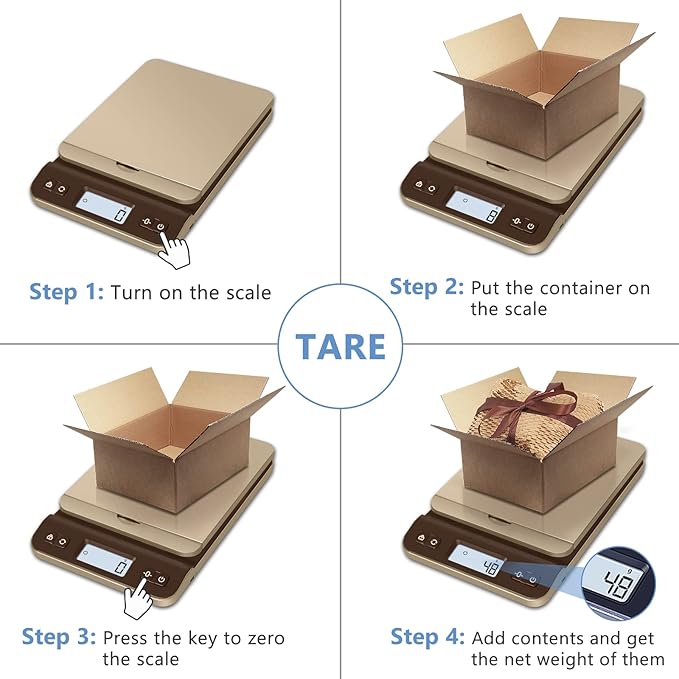 - HOLD & TARE FUNCTION: Hold function locks the weight, which is still displayed on the screen after the package is removed from the platform. Tare function zeroes out the container on the platform and only measures the contents of the container