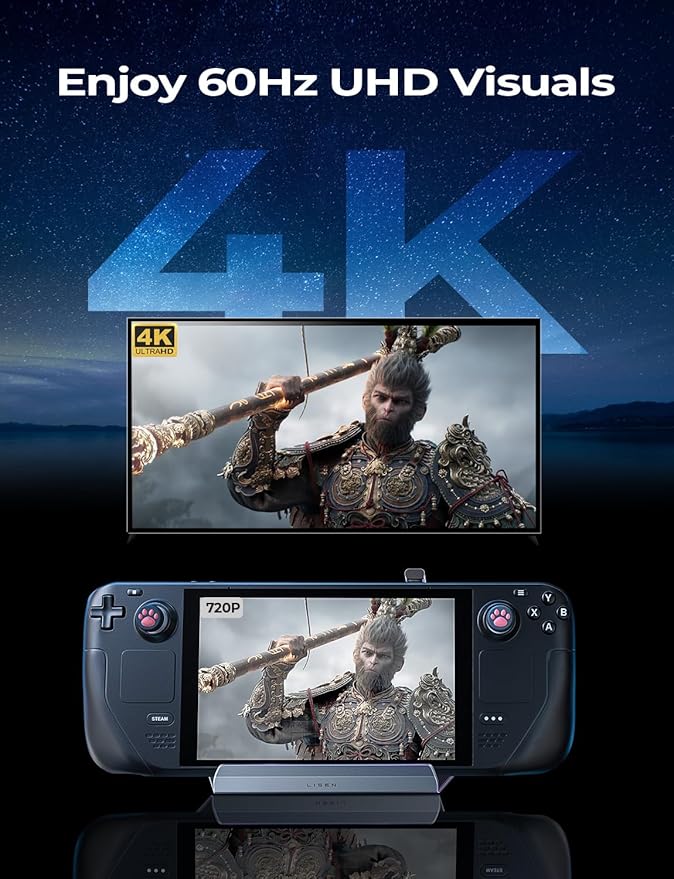 - 4K@60Hz HDMI Output: The Steam Deck Dock comes with a 4K@60Hz HDMI 2.0 output. When you connect an external 4K monitor, it can provide you sharper and smoother visual experience, so you can enjoy the visual feast on your games.