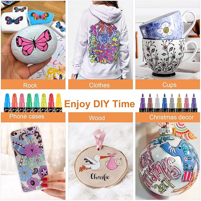 - 【Work Well on Diverse Surface】Betem acrylic markers provides smooth inking for a variety of surfaces such as paper, cardstock, metal, rock painting, wood, plastic, canvas, fabrics, ceramics, and more. High-quality opaque water-based ink with odorless and acid-free. Keep your artwork colors alive for a long time. Just express your imagination!