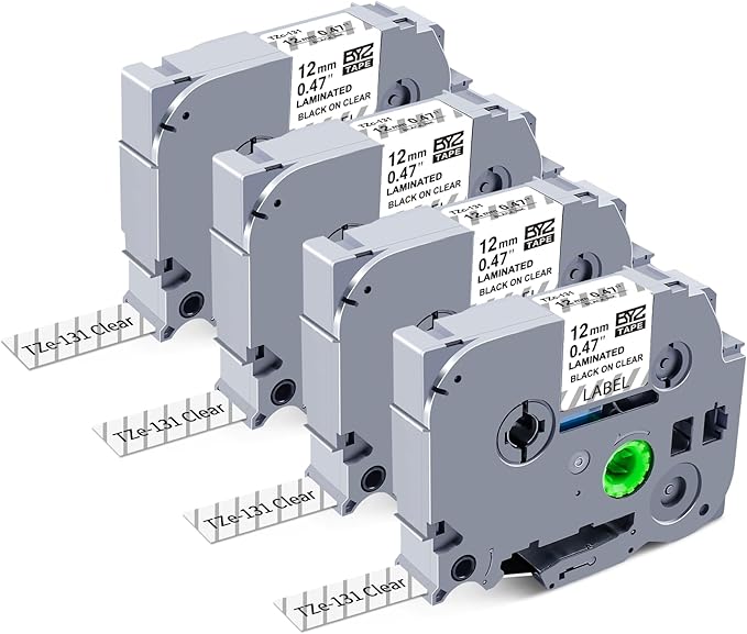 - Package: 4-Pack tze-131 12mm 0.47 laminated black on clear tape Replacement for Brother P Touch TZe-131 TZ-131, 1/2 Inch x 26.2 feet (12mm x 8m).