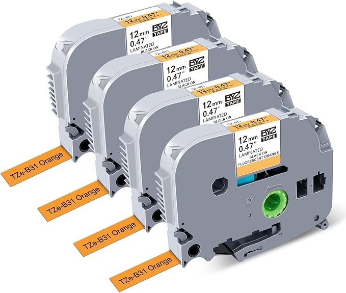 - đź›’4-Pack Compatible for Brother P Touch TZe-B31 Label Maker Refills Tape, Black Ink on Orange Fluorescent Tape; Size: 1/2 inch(12mm) width, 26.2 feet(8m) length of each TZe-B31 Label Tape.