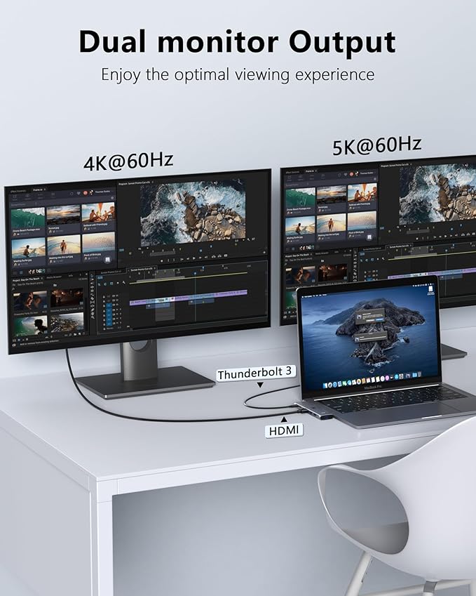 - 【A Multifunctional USB-C port compatible with Thunderbolt 3/4 】In this Macbook Pro dongle,one USB-C Port compatible with Thunderbolt 3/4 supports data transfer up to 40Gb/s, up to 5K displays, up to 100W power; It and HDMI port can be used simultaneously to support dual monitor display ,to mirror or extend your laptop's display to your TV, monitor or projector[Note: For M1M2M3 , this macbook accessories does not support dual display. Another usb c port is only for data transfer, speed usb 3.0 ]