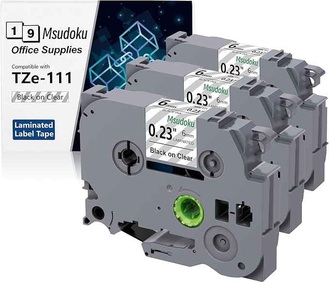 - These compatible for brother label maker tape 6mm 0.23 TZe-111 TZe111 have strong adhesive and no sticky residue when you remove it. The split back design of ptouch label tape 6mm clear tape is very easy to peel off