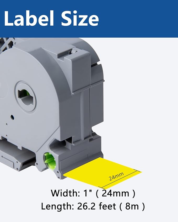 - Size - 0.94" width x 26.2' length ( 24mm x 8m ) each 24mm label maker tape. Color - Black ink on yellow tape