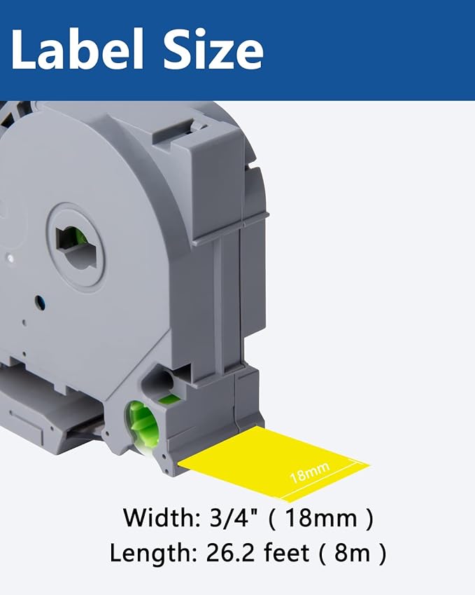 - Size - 3/4" width x 26.2' length ( 18mm x 8m ) each 18mm label maker tape. Color - Black ink on yellow tape