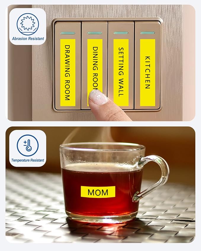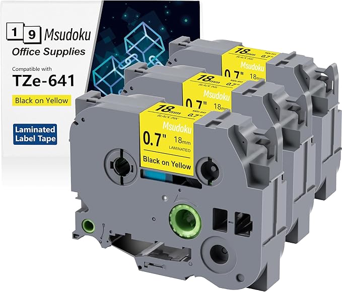 - These compatible for brother label maker tape 18mm 0.7 TZe-641 TZe641 have strong adhesive and no sticky residue when you remove it. The split back design of ptouch label tape 18mm yellow tape is very easy to peel off