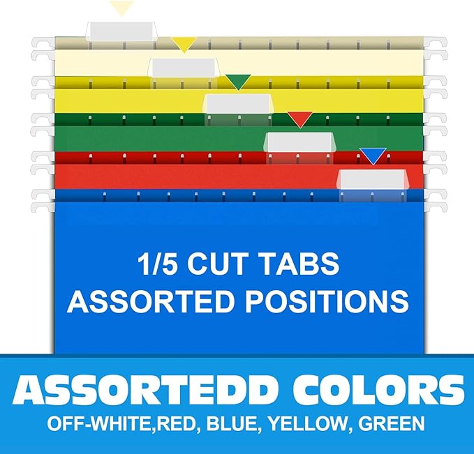 - HANGING FOLDERS SET: Contains 60 extra capacity folders with 60 cardboard supports, 60 printable label sheets, 60 clear plastic tabs and comes in 5 assorted primary colors (beige, red, blue, yellow, and green) to make color coded filing a snap.