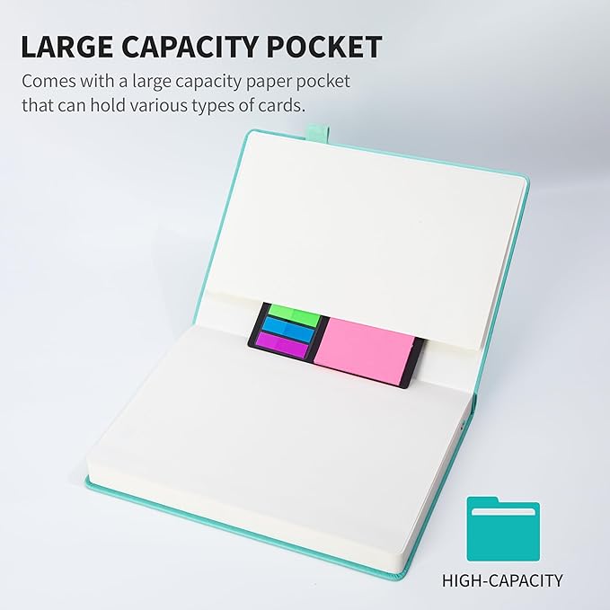 - đăMultifunctional AccessoriesăâThis classic 5.6" x 8" vegan leather journal features a durable and water-resistant cover, 320 college ruled lined pages, inner expandable pocket, pen holder, ribbon bookmark & elastic closure band