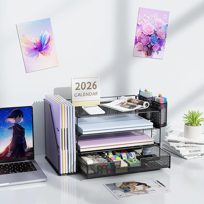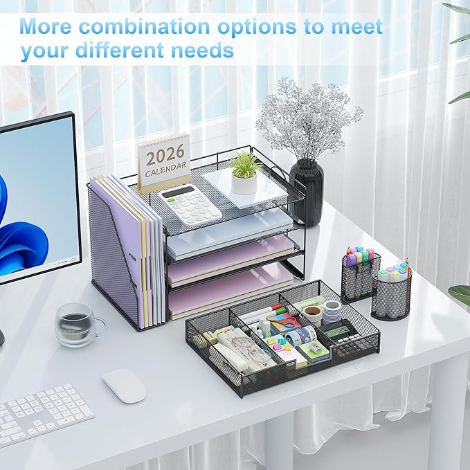 - đăEfficient Organizationă: The office desk organizers has built-in 4 trays, a file organizer rack, 2 pen holders and a sliding drawer, which can help you quickly identify the storage content of each compartment, and a clean desktop makes you more creative.