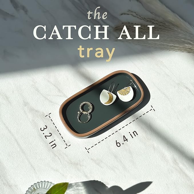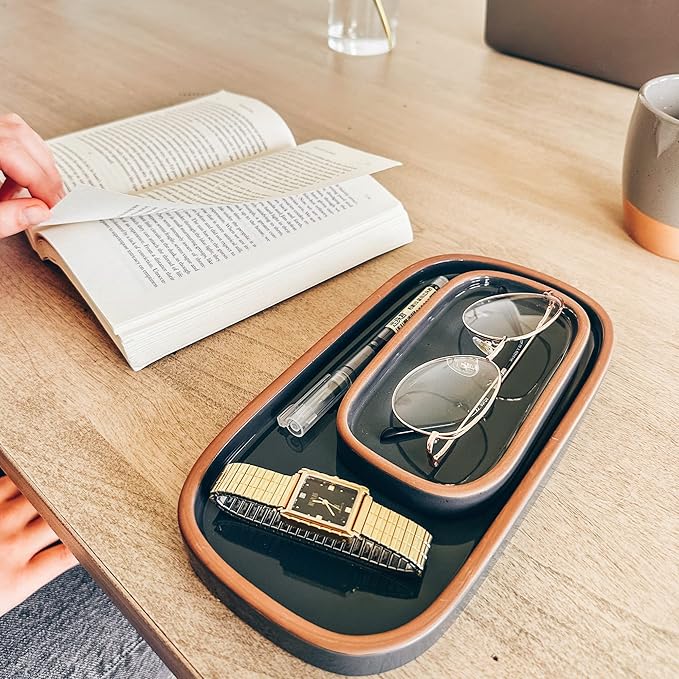 - VERSATILE USES: We all love a multi-functional object. Trays are all the rage right now and with good reason. Storing things on a tray gives a minimal and organized aesthetic and can be used for an endless amount of things. Your stationary, soap dispensers, brushes, candles, cosmetics, jewelry etc all deserve a beautiful home. The glaze is also food grade and work great for serving cheese, sushi, mini cakes, etc.