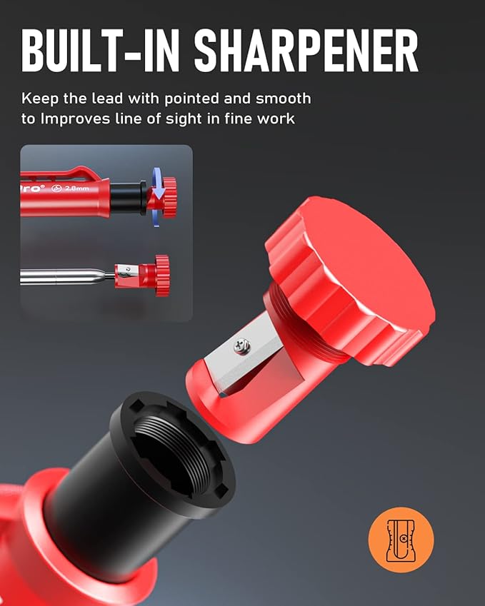 - Deep Hole Marker Pencil With Sharpener: The 2pack deep-hole construction pencils adopts 45mm elongated tip design, which is more convenient to mark in the small hole or in other tight areas. In addition this, the woodworking pencils come with a built in sharpener screwed into the top of each work pencil for providing nice precision at all times
