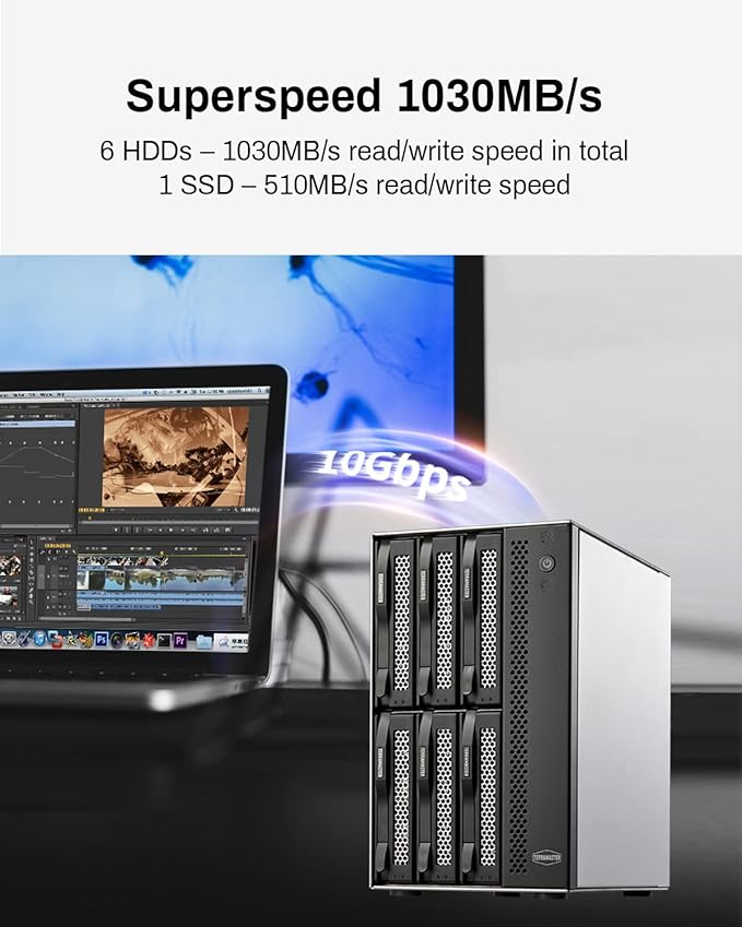 - High Speed: The D6-320 hard drive enclosure adopts USB 3.2 Gen2 protocol for high-speed data transmission up to 10Gbps. With 6 hard drives installed, the read/write speed can reach up to 1,030MB/s (SATA III HDD 8TB x 6). With one SSD installed, the read speed can reach 510MB/s (SATA III 1TB SSD x 1).