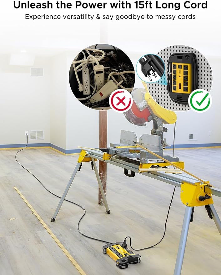 - [15Ft Cord & Metal Housing] Crafted with a 14 AWG ETL Certified cord, this power strip offers both durability and extended reach. The metal housing ensures enhanced safety and longevity, making it ideal for garages, workshops, and more.