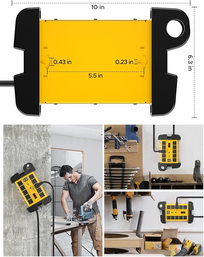 - [Wall mountable&Cord Management] Design with cord holder for wrapping the cord or hanging on, two mounting keyholes on the back, mount metal power strip on the wall to provide easy access for electrical tooling, compact shape makes it available mount to the workbench or under a desk.