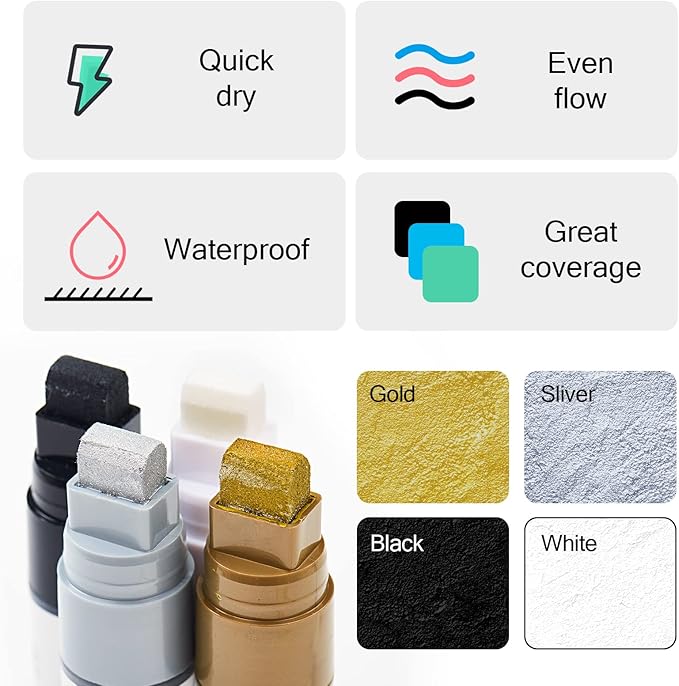 - 【Classic 4colors Acrylic markers set】This acrylic markers pack with 4colors- Black/White/Gold/Silver. Acrylic pigment with high color saturation, different colors do not mix with each other and can be completely covered each other. Painting on different material surfaces is just like painting on paper, long-lasting vibrant colors.