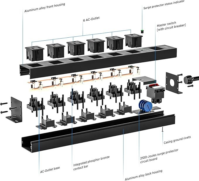 - [Metal Heavy Duty] Heavy duty power strip with 1.5mm extra-thick aluminum alloy housing and reinforced engineering plastic covers make it extremely strong and durable. The 6 outlet power strip is equipped with a sturdy 6ft cord, allowing convenient placement of the metal power strip in locations far from the power source without worrying about the cable being too short. And 15AMP/14AWG SJT grade wire supports up to 125V/1875W of power.