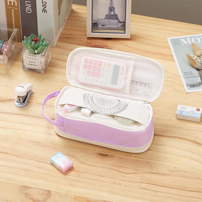 Large Pencil Case Zipper Pencil Pouch for Girls Adults Kids Aesthetic Pencil Bag Organizer Big Capacity Pen Bag with Handle Portable for School Office Purple
