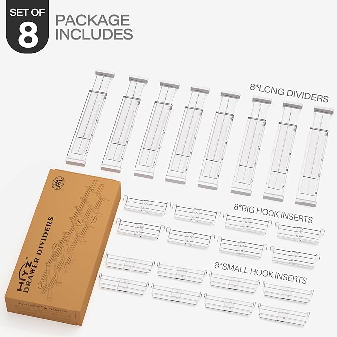 HiYZ Expandable Drawer Dividers with Inserts - 2.36'' High Adjustable Drawer Organizers Separators for Kitchen, Bedroom, Dresser, Office, 8 Long Dividers(12.6-22.8'') with 16 Inserts(3.9-7.1'')-Clear