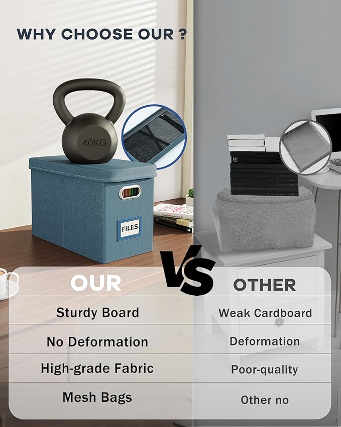 - 【Sturdy & Stackable】Portable storage box is made of well-made linen fabrics and durable material, with good support and bearing capacity, and the box top can withstand 100 lbs. The document boxes can be stacked when in use, or folded for easier storage when not in use.