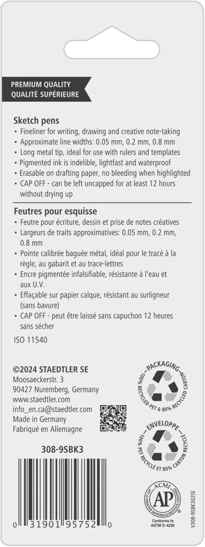 STAEDTLER Pigment Liner Pack, Black, 3 Pens, Assorted Line Widths 0.05mm/0.2mm/0.8mm, 308-9SBK3
