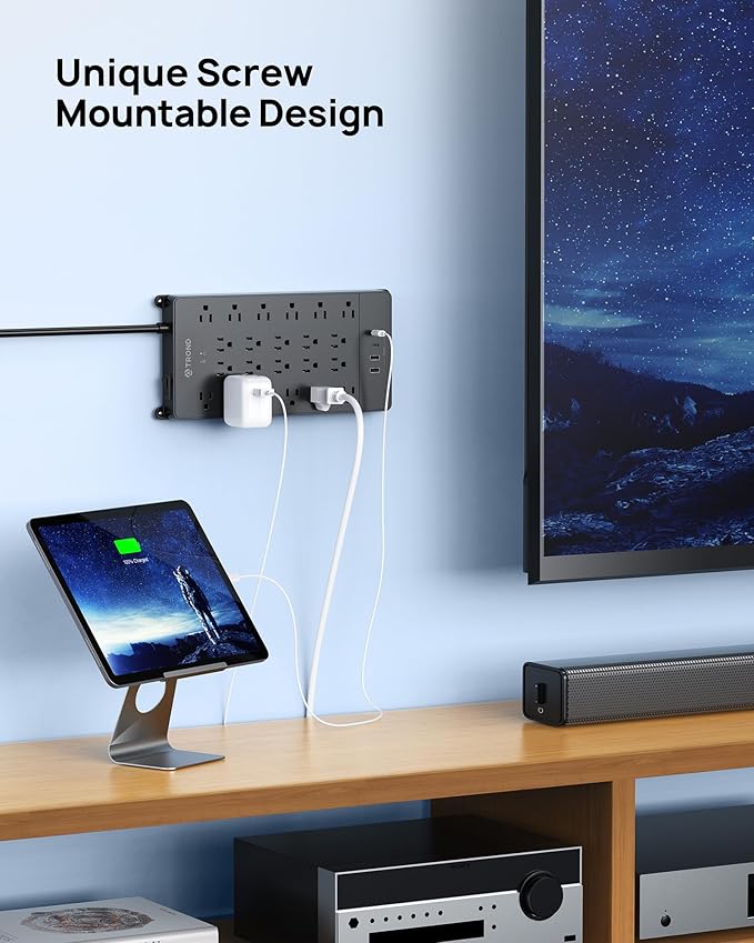 - 【Mountable and Flat Plug】Our power strip equipped with 4 screw holes in the corners, allows you to securely mount the surge protector box on the wall or under the desk. The 45° angle flat plug design is perfect for hiding behind furniture, bookshelves, and bedside tables in tight spaces.