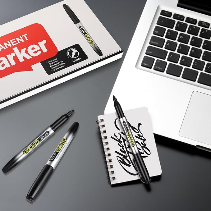 - Multi-Surface Use: Set of 24 black permanent markers designed for effortless marking on paper, plastic, cardboard, metal, and more. Unleash your creativity on various surfaces!