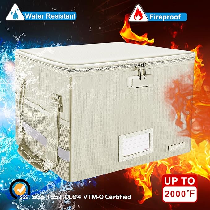 - Fireproof and water-resistant: Fireproof lock box is made of double layered non-itchy silicone coated fiberglass which stands up the temperature up to 2000℉.It has been passed by SGS TEST(UL94 VTM-0 Certified).Fireproof file box is not only fireproof but also high water resistant in case it gets wet for any reason.Nothing is completely foolproof, but added protection is always a good idea.