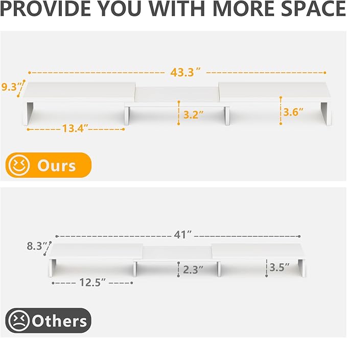 - Customize your Desk Organizer: Our computer monitor stand for desk has adjustable length (30.7-43.3 inch) and angle, especially, the ability to change the angles of the end pieces. The desktop monitor stand can easily be moved adjusted to suit the curve of your monitors and fit smaller or larger desks! It can be used as a laptop riser if you are working in bed, a storage table in your bedroom, studio and so on.