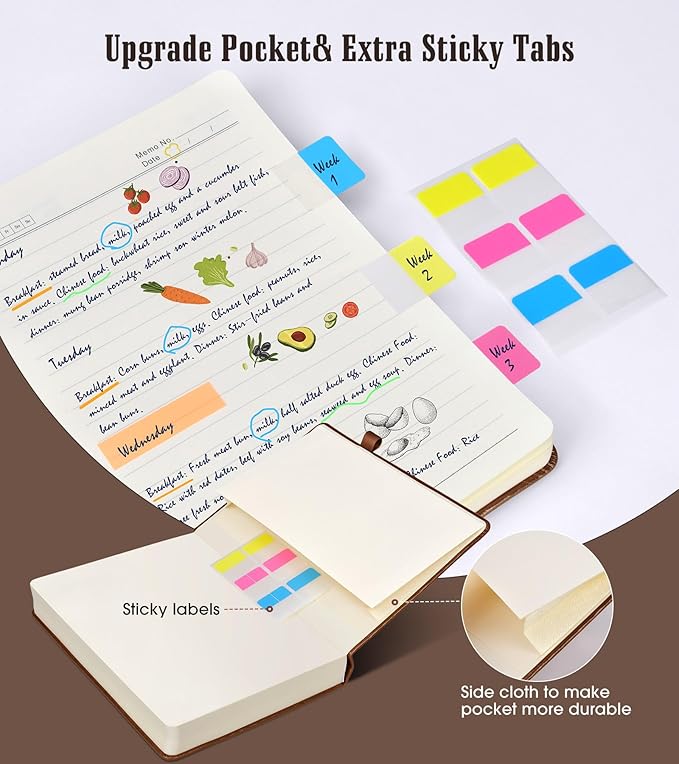 - 【Upgrade Lined Journal Notebook】Comes with 1 elastic closure band & 1 elastic bookmark band, more stable. An expandable inner storage pocket to keep track of appointment cards,notes,receipts,and more. 1 gift of multicolor index tabs stickers for papers classifying and marking.