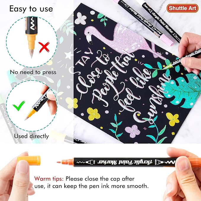 - 【28 UNIQUE AND METALLIC COLORS】: Shuttle Art 28 acrylic paint markers set contains 28 METALLIC colors: With so much colors, you can almost complete all of your daily creations.