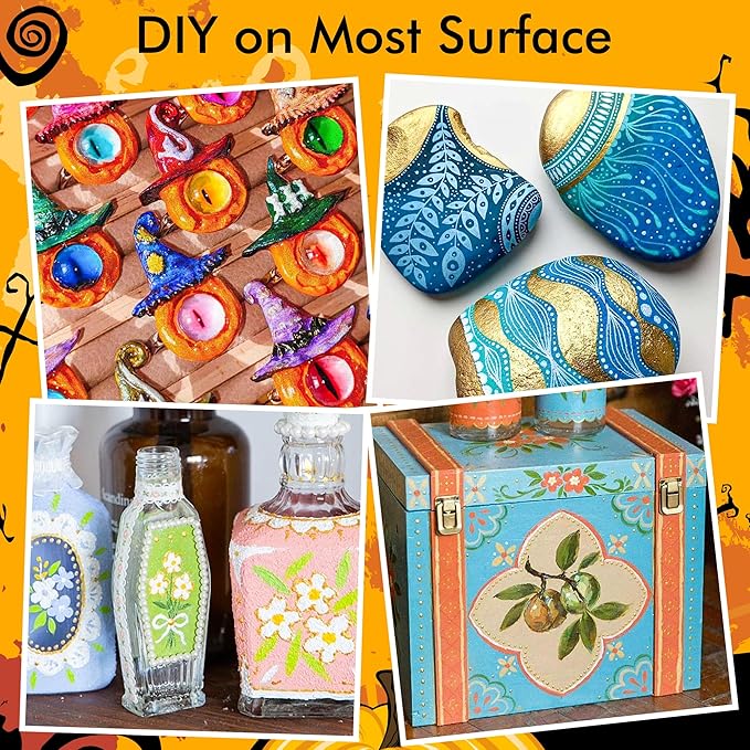 - 【MULTI-PURPOSE】: Enjoy creating art projects on a variety of surfaces, acrylic paint marker set suitable for rock painting, ceramic and mug painting, glass and wine glass painting, wood, fabric, stone, metal, plastic, canvas, Christmas ornament, Halloween pumpkin painting, calligraphy, scrapbook, bullet journal, brush lettering, custom mugs, DIY crafts projects, and much more for both smooth and porous surfaces.