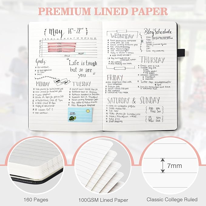 - 【Premium Writing Experience】These lined journals boast 100GSM paper with 80 sheets (160 pages). The paper is compatible with a wide range of pens, ensuring a seamless writing performance without any ink bleed-through. The 7mm line spacing is suitable for most people's writing preferences. Additionally, the pages can lay flat at 180°, allowing for easy note-taking. Ideal for school, office, outdoor activities, and travel.