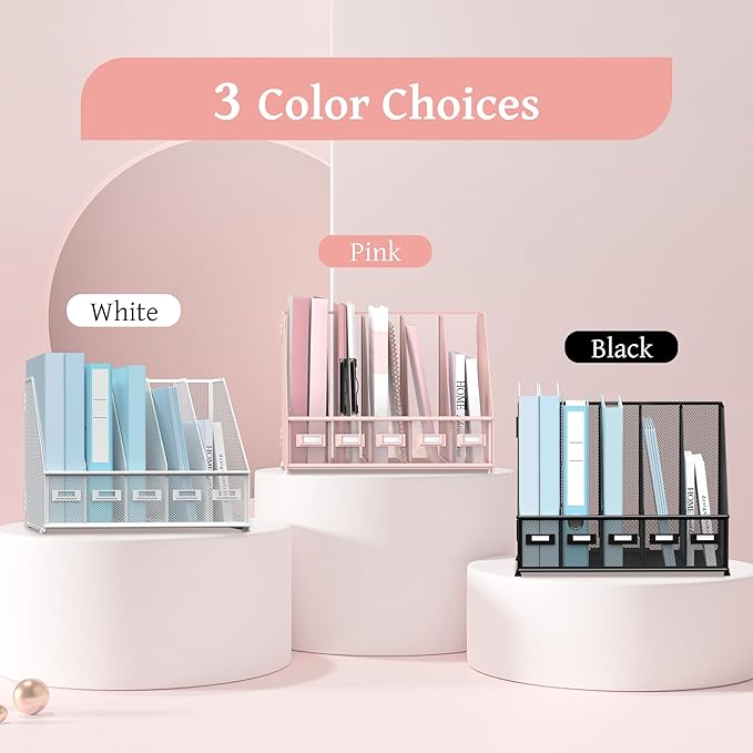 - [Space-Saving] Our mesh magazine file holder features 5 compartments, designed to consolidate your desktop items. This file organizer tames desk clutter, saves valuable space, and maintains a clean and orderly workspace.