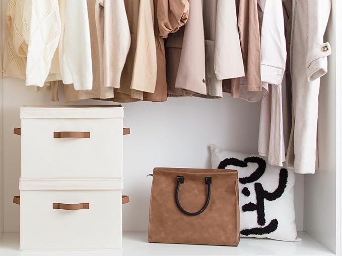 StorageWorks Fabric Storage Bins with Lid, Decorative Storage Boxes for Shelves, Stackable Closet Organizer Basket with Handles, Jumbo, Ivory White, 2-Pack