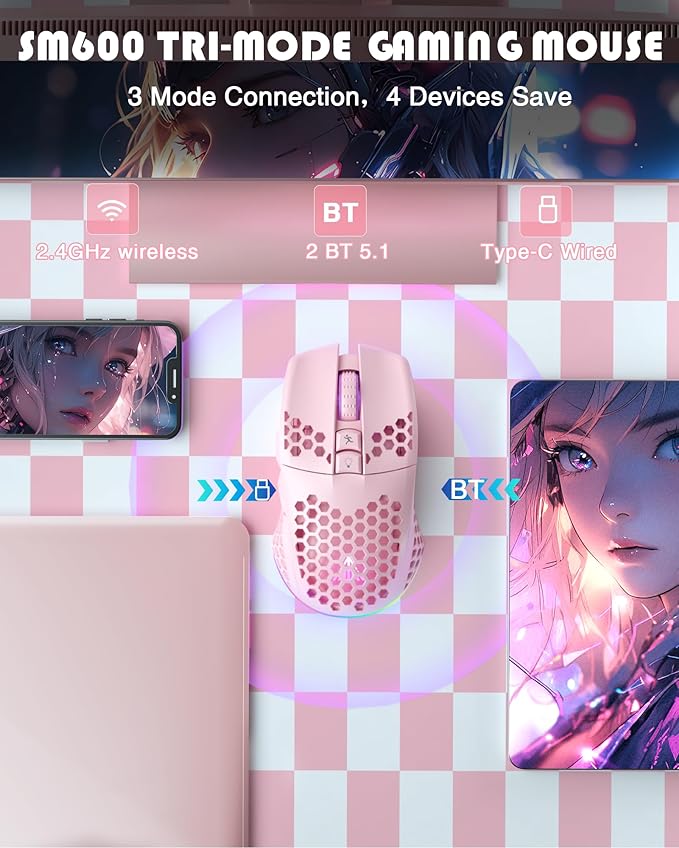 SM600 Pink Wireless Gaming Mouse with Honeycomb Shell, Side Buttons,Tri-Modes(BT5.1+BT5.1+2.4GHz) Lightweight RGB Wireless Mouse for PC/Tablet/Desktop/Office/Games