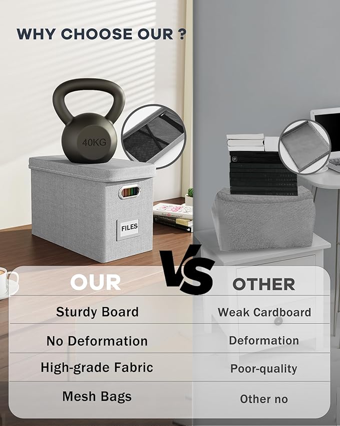 - 【Extra Mesh Bag on Lid】Grey letter size file organizer box has an extra mesh pocket on lid which can store little things such as pens, invoices, papers, scissors,etc. With more storage space design, more efficient storage of documents and items.