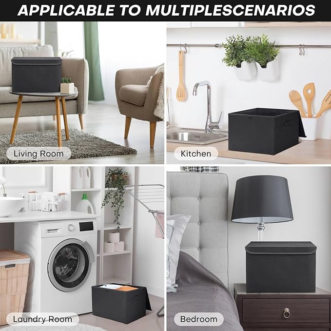 Large 22 Quart Linen Fabric Foldable Storage Bin Cube Organizer Basket with Flip-Top Lid & Handles, Clothes Blanket Box for Home, Office, Closet, Black, 4 Pack 14.6 x 9.5 x 9.5”