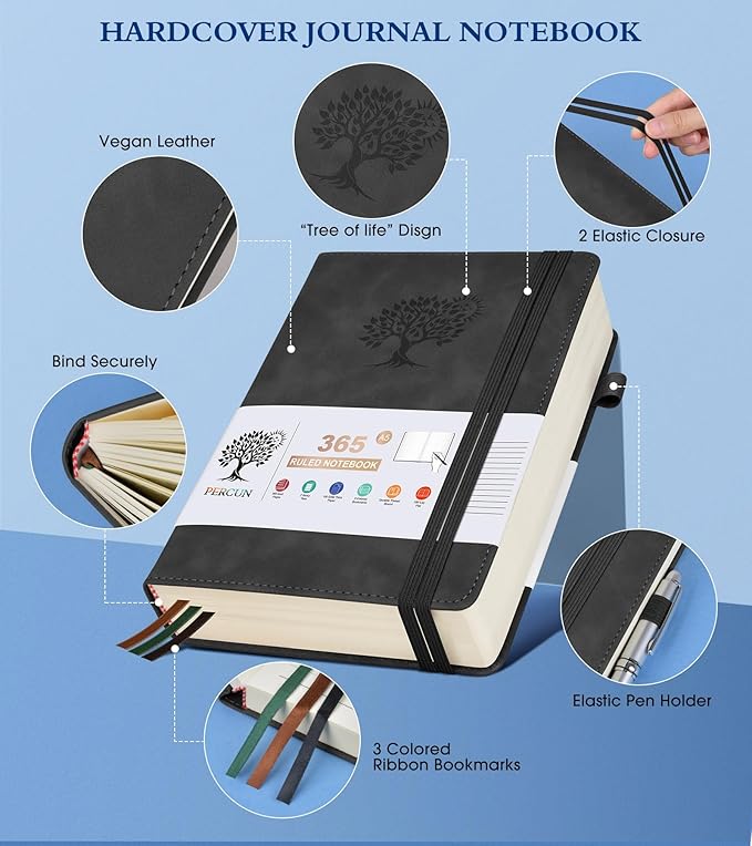 - 【365 Pages Premium Thick Paper】: Our PERCUN lined journal notebook is made of 365 pages high-quality 100Gsm thick ruled pager with an acid-free light Ivory paper that is thicker than normal. This premium quality paper will not cause bleeding, ghosting or smudging and is suitable for most types of pens,provides ample space for journaling, note-taking, and creative writing. The line spacing is 7mm, making it easy to write legibly and neatly.