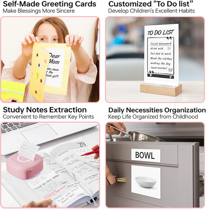 - [Enjoy More Interesting Life] New style inkless pocket printer is used to print pictures/photos,memo,shopping lists,study/meeting notes and etc.Mini sticker printer machine,it's a great helper to decorate your bullet journal more memorable,to make photos more stylish,to organize study notes more efficiently,to keep track of happiness moments at anytime etc.Undoubtedly,it must be a special gift for children,students,teachers and DIY craftsman on Christmas,Children's Day and Thanksgiving day.