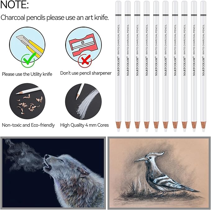 - PROFESSIONAL WHITE CHARCOAL PENCILS SET - This set of 10 pc white charcoal pencils are ideal for use on dark or tinted paper. blend and shade with ease, suitable for use with black paper visual diaries, charcoal & graphite products.